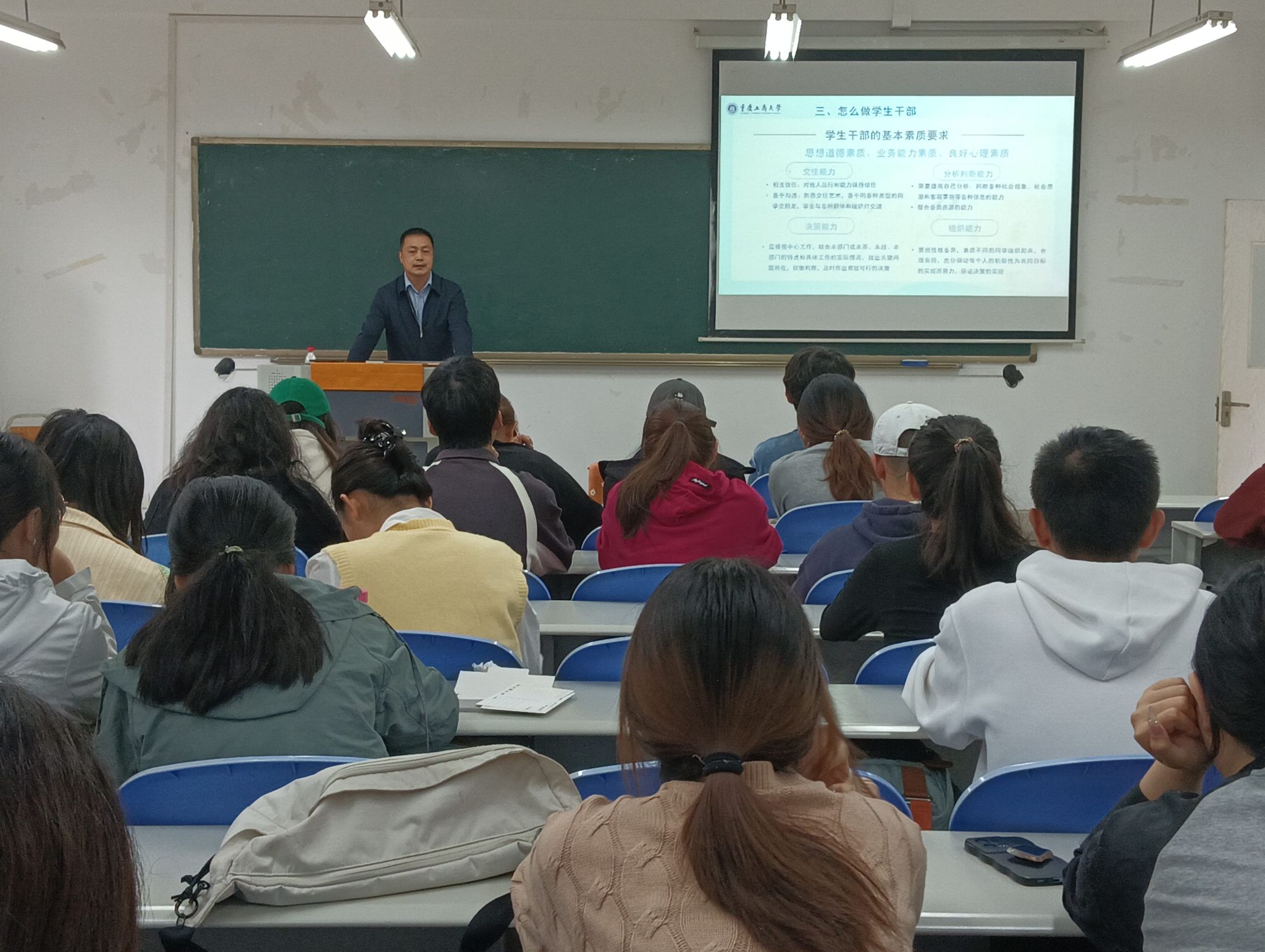 白海龙对班干部和党员同学们在班级和学生事物中的引领作用进行了充分肯定。他从什么是学生干部,为什么做学生干部,怎么做学生干部,学生干部做什么四个方面进行培训,明确指出学生干部要有良好的思想道德素质、业务能力素质、心理素质以及工作执行能力等,强调学生干部应树立三个意识,增强三个主动,充分发挥学生干部模范带头与信息上传下达的基本作用,要求学生干部与班级同学、老师等要充分沟通交流,要在未来的工作与学习中以身作则,共同致力于班级文化建设,为学院和学校的建设贡献出更多的力量。