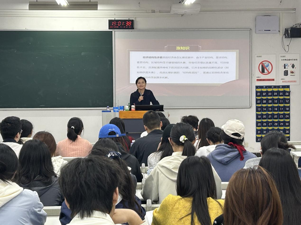 课堂上,任毅从中国经济发展的“变”与“不变”切入,结合当前经济技术条件与内外部环境,层层剖析经济运行的核心脉络。用大家熟悉的“身边事”举例——从小区周边连锁商超的稳定供应,看产业链供应链的自主可控能力;从日常使用的国产APP功能迭代,聊科技创新的“破局”成果;从家乡基础设施的持续完善,谈内需市场的潜力与活力。一个个鲜活案例,将“应对外部冲击的能力和底气”具象化,让原本宏观的经济话题变得可感可知。不仅解答了同学们对经济热点的疑惑,更引导大家跳出“碎片化信息”,用辩证视角看待中国经济的机遇与挑战,进一步坚定了对国家经济发展的信心,也为同学们将个人发展与国家需求相结合提供了清晰指引。
