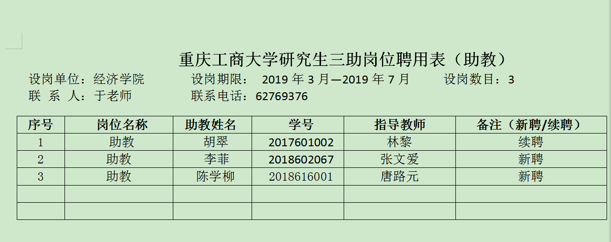 根据《关于2018-2019学年第2学期研究生助教岗位公示及开展聘用工作的通知》的相关要求,经个人申请、指导教师筛选、学院审议,拟同意聘用胡翠等3名同学就任2018-2019学年第二学期研究生助教,现予以公示。