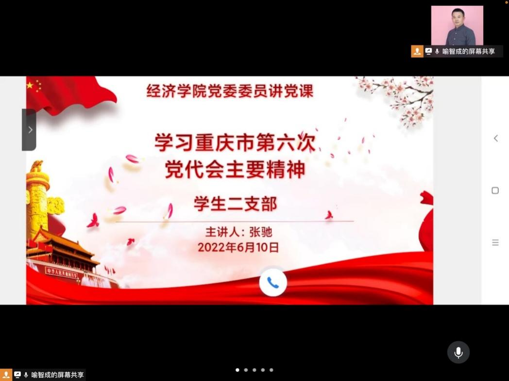 2022年6月10日,太阳成集团tyc539学生第二党支部线上开展“学习重庆市第六次党代会精神”主题党课活动。本次活动邀请到我院党委委员——张驰博士为全体支部党员领学,会议由支部书记喻智成老师主持,全体党员参加。