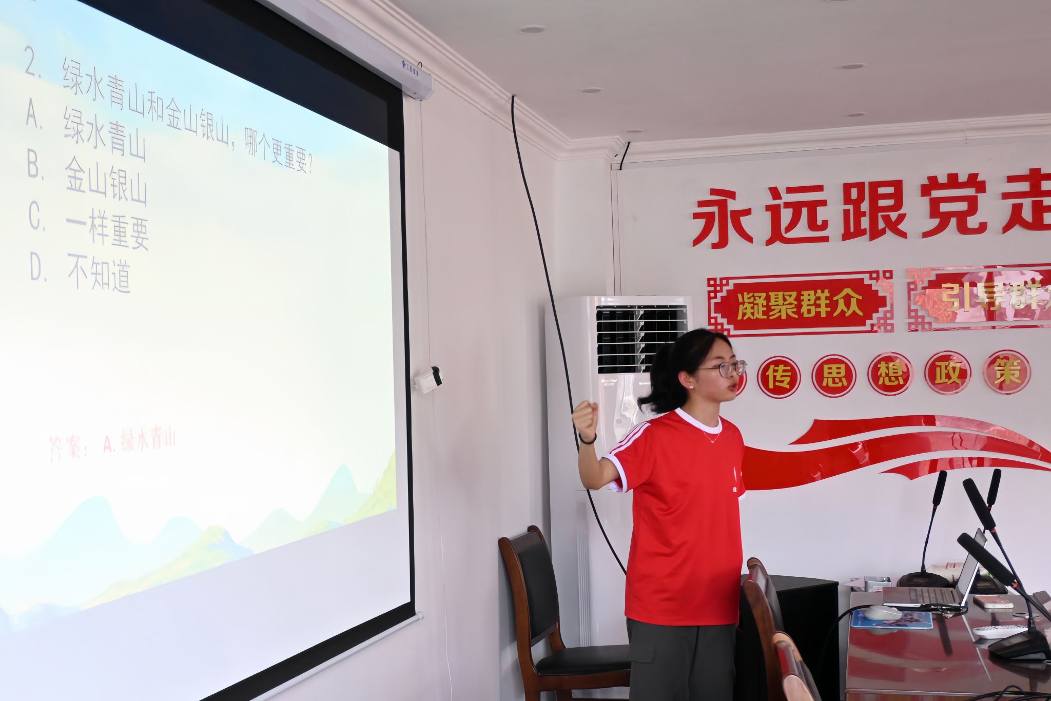 活动伊始,主持人简要介绍促进团的来意和目的,由促进团成员为到场民众分发参会小礼品。随后,正式进入学习环节,通过观看两段关于浙江安吉余村环境与经济变化的视频——从昔日的过度开采自然资源的“首富村”到环境恶化衰退,再到如今焕发新生的绿水青山旅游村的光辉历程。视频学习配合主持人讲解,最终点出“宁可要绿水青山,不要金山银山”“绿水青山就是金山银山”的理念。深切感受到了环保与可持续发展的重要性,强调绿水青山不仅是自然环境的宝贵财富,更是推动经济社会可持续发展的重要支撑。