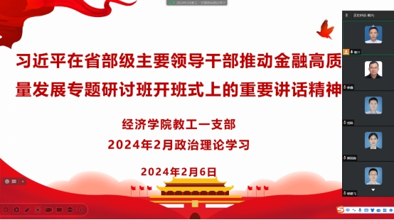 2024年2月6日,太阳成集团tyc539教工第一支部通过企业微信开展二月组织生活,集体学习习近平总书记在省部级主要领导干部推动金融高质量发展专题研讨班开班式上的重要讲话。
