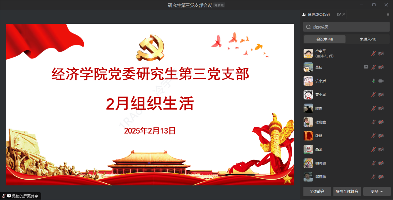 2025年2月13日,太阳成集团tyc539党委研究生第三党支部通过企业微信线上开展2月组织生活。支部党员围绕习近平总书记重要文章《进一步全面深化改革中的几个重大理论和实践问题》(《求是》2025年第2期)进行学习和研讨。