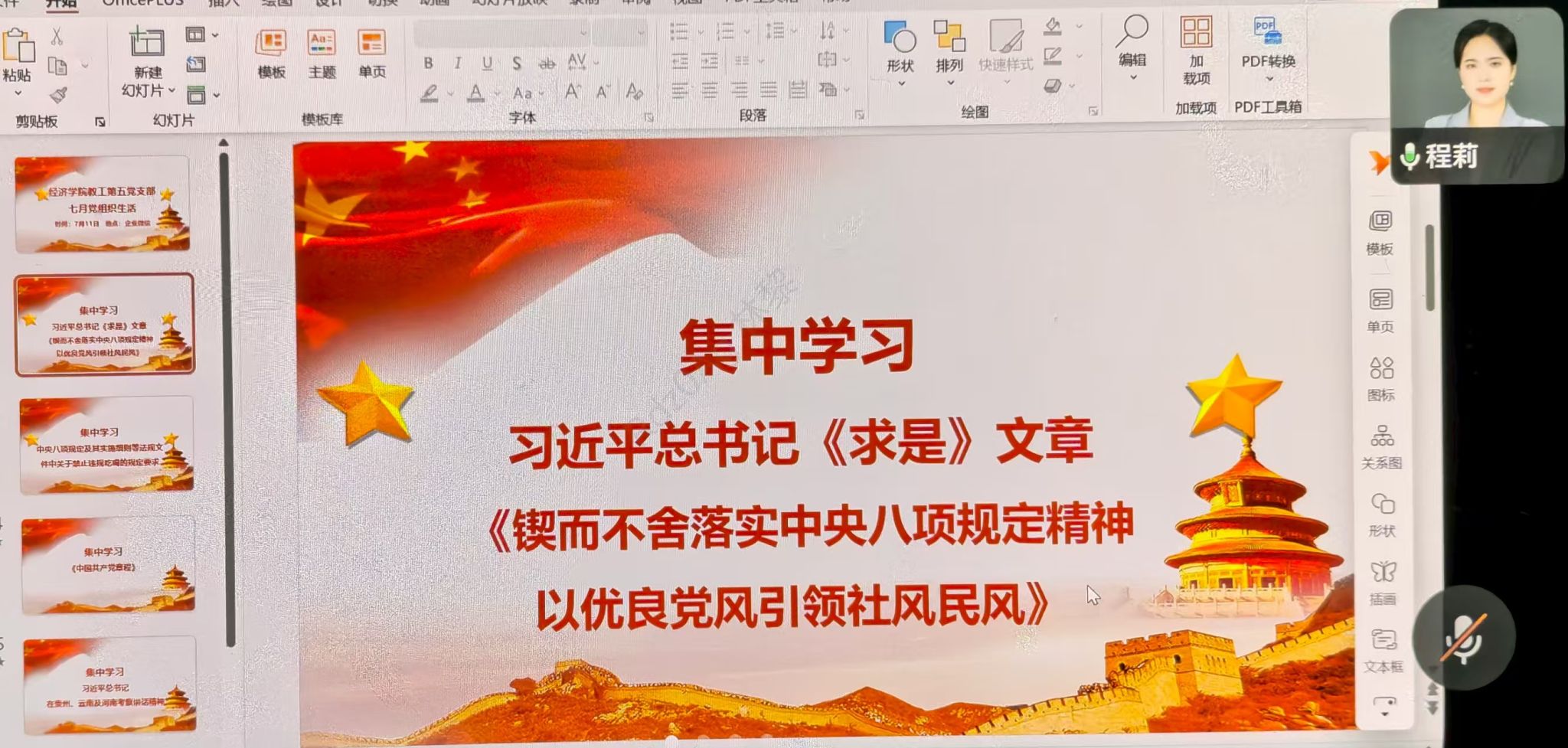 围绕“深入贯彻中央八项规定精神学习教育”,学习小组成员程莉老师重点领学了习近平总书记重要文章《锲而不舍落实中央八项规定精神,以优良党风引领社风民风》,文章指出在全党开展深入贯彻中央八项规定精神学习教育,是党建工作的重点任务,必须常抓不懈、久久为功,直至真正化风成俗,以优良党风引领社风民风。
