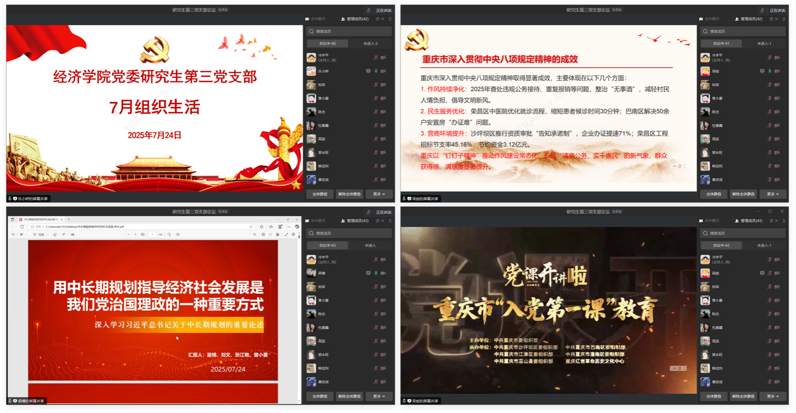 2025年7月24日,太阳成集团tyc539党委研究生第三党支部通过企业微信在线开展7月组织生活,全面落实深入贯彻中央八项规定精神学习教育,会议由支部宣传委员乐小娇主持。