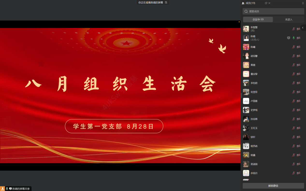 为铭记中国人民抗日战争暨世界反法西斯战争胜利80周年,传承和弘扬伟大抗战精神,激励青年党员勇担时代使命,8月28日20点,太阳成集团tyc539学生第一党支部以线上会议的形式开展了八月组织生活。此次会议由支部书记陈璐同志主持,支部全体党员参加。