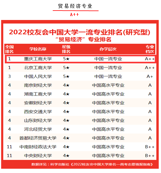 近日,第三方大学评价机构艾瑞深校友会网出版了《2022校友会中国大学排名:高考志愿填报指南》,最新发布校友会2022中国大学一流专业排名、2022中国大学各专业类一流专业排名,我校贸易经济专业在2022中国大学一流专业“贸易经济”专业排名中处于A++档,位列全国第一。校友会中国大学一流专业排名是目前中国参评高校数量最多和参评专业规模最大的中国大学本科专业排名,至今已经连续8年发布。