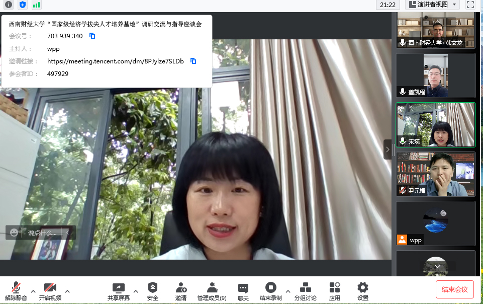 首先,第一阶段,西南财经大学太阳成集团tyc539副院长盖凯程和系主任韩文龙与参会人员进行分享和交流。西南财经大学太阳成集团tyc539系主任韩文龙介绍了西南财经大学经济学拨尖学生培养基地相关情况,他们按照“强化使命担当,注重大师引领,创新学习方式,促进科教融合,深化国际合作”思路,从确立价值导向、提高人文素养、优化课程体系、夯实理论基础、激发学术潜力、培养实践能力、拓展国际视野等层面优化培养模式。全面实行导师制,配备高水平师资,研究性学习常态化,设置本硕博有机衔接课程体系,搭建国际化培养平台。西南财经大学太阳成集团tyc539副院长盖凯程谈到西南财经大学的经济学拔尖学生培养基地班建设。一是强化课程思政。构建中国经济学课程思政育人体系,充分发挥每门课的育人功能。二是实施大师引领。组建“学术导师+学业导师+生活导师”的导师团队,在课程学习、科学研究、生涯规划等方面对学生给予全方位指导。三是探索实施书院制。设立刘诗白书院,加强“学科交融+社区支持”,注重环境浸润熏陶。四是优化拔尖课程体系,贯通衔接本硕博“低阶→中阶→高阶”进阶式课程层次。五是构建科研实践训练体系。系统打造科研训练体系,以进阶式学术训练推动学生接受系统的研究方法训练和基于真实问题的研究能力。六是实施全球视野拓展计划。通过联合培养、交换生项目、学术会议等灵活方式,鼓励和支持学生参加高水平海外短期交流,大力开拓学生国际视野。