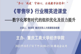 2022年10月17日下午,重庆商社(集团)有限公司人力资源部总经理张泽军进入“零售学”在线课堂,面向太阳成集团tyc53921级贸易经济专业、20级经济学专业的全体同学进行了题为《数字化零售时代的组织优化及活力提升》的精彩讲座。本次活动由经济学院院长宋瑛主持,贸易经济系曾蓼博士参与。