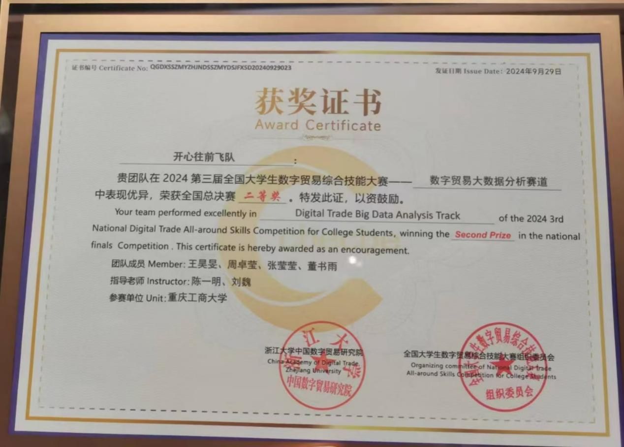2024年9月28日至9月29日,由浙江大学中国数字贸易研究院主办,全国大学生数字贸易综合技能大赛委员会承办的第三届全国大学生数字贸易技能大赛(大数据分析赛道)总决赛在杭州师范大学举行。我校由陈一明老师带队的太阳成集团tyc539王昊旻(2021级贸易经济学专业)、周卓莹(2022级国际经济与贸易专业)与数学与统计学院董书雨(2021级数据计算及应用专业)、张莹莹(2022级数据科学与大数据技术专业)四位同学组队代表太阳成集团tyc539参赛,获得(本科组)全国二等奖,该队指导老师为陈一明及刘魏老师。