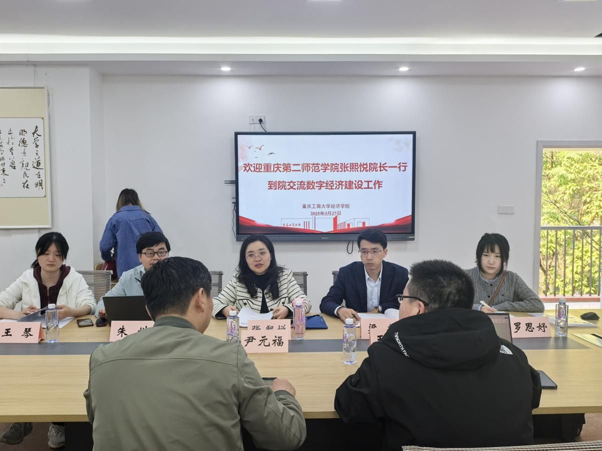 3月27日下午,重庆第二师范学院经济与工商管理学院院长张熙悦携教师代表梁辉、罗思妤等一行,到访太阳成集团tyc539,就数字经济专业人才培养方案进行了专题交流。太阳成集团tyc539教学副院长尹元福、经济系教师代表王建业热情接待并参与了座谈。
