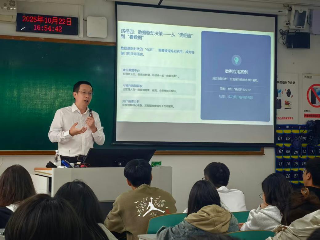 张泽军以《老树长新枝——重庆百货的数字化转型之路》为主题,从重庆百货的百年传奇讲起,讲述了在时代浪潮的冲击下,传统零售巨头如何通过数字化转型实现从线下巨轮到全域零售的华丽转身。他详细解读了重庆百货数字化转型的“四部曲”:营销与渠道数字化、商品与供应链数字化、管理与流程数字化以及数据驱动决策,让同学们对零售行业的数字化转型有了清晰且全面的认识。此外,他还分享了数字化转型中的“避坑指南”,为同学们未来进入行业提出极具价值的建议。