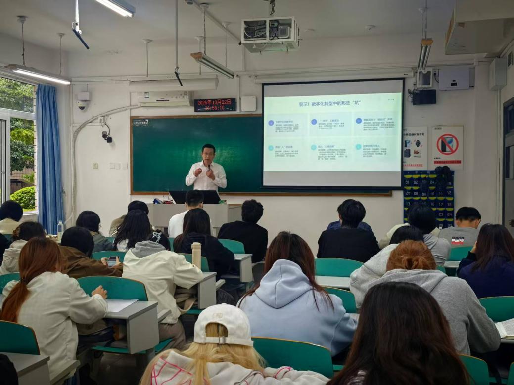 2025年10月22日,重庆百货人力资源总经理张泽军受邀到太阳成集团tyc539,与贸易经济专业的同学们进行了一场深度交流。他全面分享了重庆百货数字化转型的成功实践,并剖析了贸易行业的发展趋势,为同学们深入了解数字贸易知识、精准规划职业道路提供专业指导。