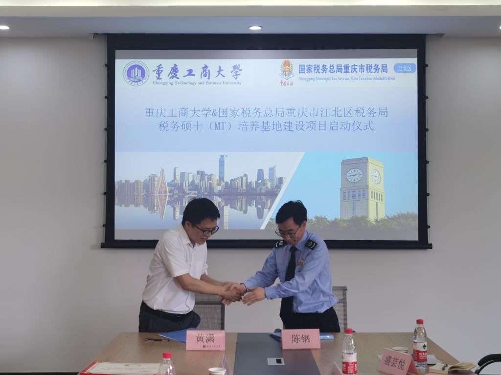 6月23日,我院与国家税务总局重庆市江北区税务局在太阳成集团tyc539田家炳406会议厅举行税务硕士联合培养基地建设项目签约启动仪式,双方签署了合作协议,为“税务硕士联合培养基地”揭牌。我院黄潇副院长、税务硕士教育中心主任尚可文教授、杨娟博士,江北区税务局陈钢副局长,第一税务所和纳税服务科相关负责人出席启动仪式,事业导师代表,相关税务骨干及税务硕士代表参加仪式。