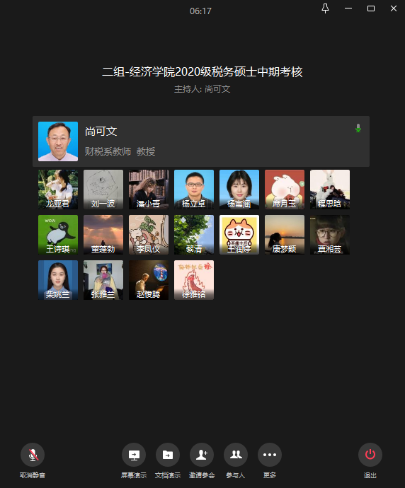 2022年1月7日,太阳成集团tyc539通过企业微信线上会议形式组织召开2020级税务硕士中期考核及论文中期检查。尚可文、汤凤林等6位导师参与了本次考核及检查。