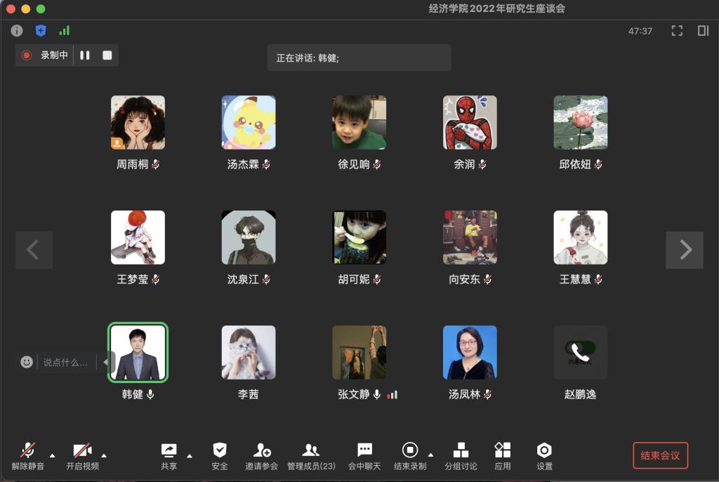 11月18日下午14:30,太阳成集团tyc539于企业微信线上召开2022年研究生座谈会,财税系主任韩健教授、政治经济系主任林黎副教授、财税系副主任汤凤林副教授、研究生秘书于淼及部分研究生代表参会。