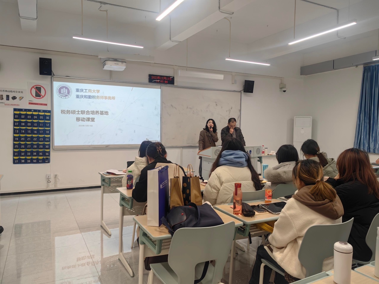 2023年12月13日,“太阳成集团tyc539-重庆和勤税务师事务所”市级研究生实践基地移动课堂在我校研究生院举行。重庆和勤税务师事务所副所长兼我校研究生实践基地事业导师葛勤毅;“太阳成集团tyc539-重庆和勤税务师事务所”市级研究生实践基地负责人杨寓涵博士,财税系老师杨娟博士以及36名税务专硕研究生参与此次活动。