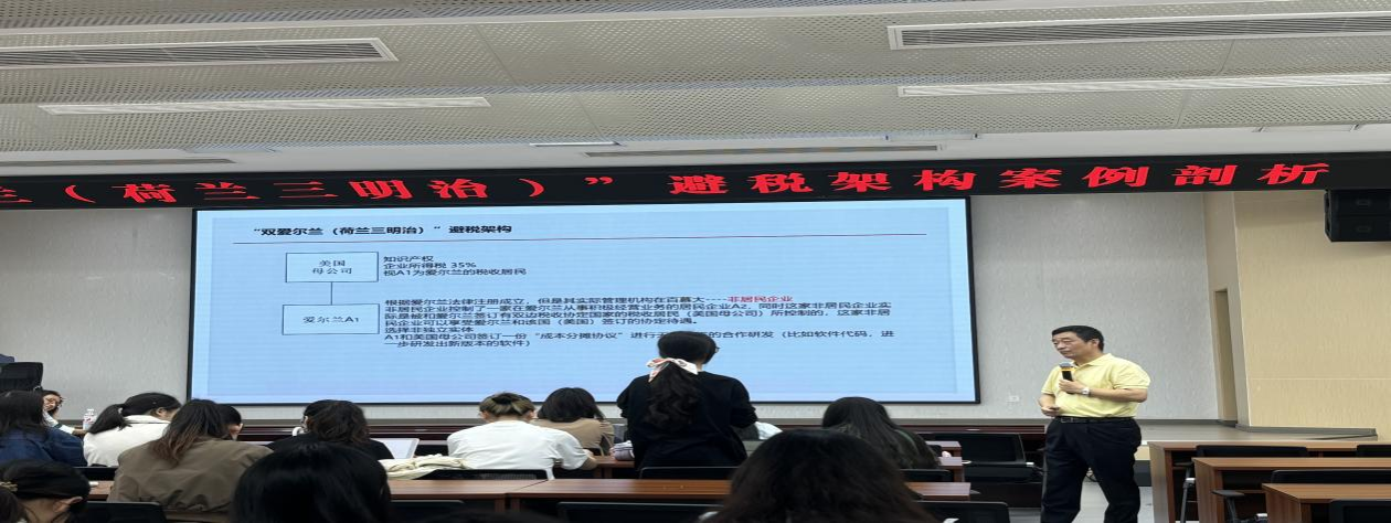 首先,任保民老师为同学们介绍了“双爱尔兰(荷兰三明治)”案件背景由来,用这个案例帮助同学们了解国际上如何利用双边税收协定、多边税收协定构建避税架构来进行避税的。任老师指出,利用各国税制差异和税收漏洞、利润转移、资产转移等-系列复杂的国际避税手段进行全球避税,是跨国公司最成功的财务策略之一。任老师通过课堂讨论,帮助同学们回忆所学理论知识,联系本案例内容进行深入理解学习。