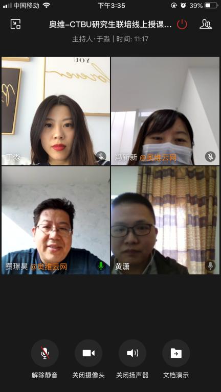 为深化校企协同合作,切实发挥研究生联合实践基地的作用,4月26日下午,学院同北京奥维云网大数据科技股份有限公司(以下简称奥维云网公司)共同召开了远程工作会。太阳成集团tyc539副院长黄潇、研究生秘书于淼老师,奥维云网公司总架构师费璟昊、经理冯新新共同参加了此次会议。