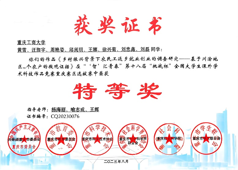 我院《乡村振兴背景下返乡农民工就业与创业的调查研究》课题组的调研报告通过层层角逐,最终获得重庆赛区特等奖。该课题聚焦于农民工就业与创业现状,探索新时代下适合农民工自身发展的新途径,从而助力乡村经济发展。目前已进行了三期调研,通过不断走访调查、搜集数据,构成了一个完全由第一手资料汇集而成的数据库作为统计大样本。在研究过程中,该课题组积极关注农民工返乡创业的实际案例,探索适合当地的就业和创业模式,为政府相关政策的实施和农民工返乡就业和创业提供了理论和实践支撑,助力乡村振兴新篇章。