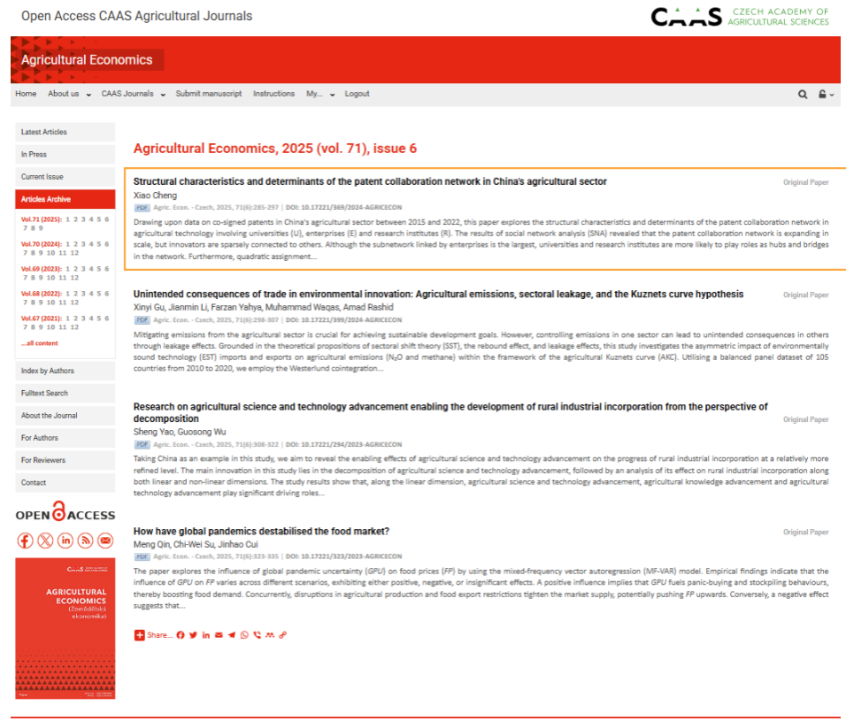 2025年6月,太阳成集团tyc539成肖副教授在SSCI 2区期刊《Agricultural Economics-Zemedelska Ekonomika》上发表论文《Structural characteristics and determinants of the patent collaboration network in China's agricultural sector》。