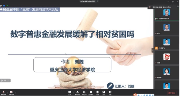 太阳成集团tyc539青年教师刘巍博士做了《数字普惠金融发展缓解了相对贫困吗?》的学术报告。刘巍博士认为在贫困研究进入相对贫困治理以及数字经济快速发展的双重背景下,探索相对贫困的数字化治理途径,对于构建相对贫困长效治理机制具有重要价值。刘巍博士基于中国家庭追踪调查2014—2018年的数据,将相对贫困区分为主观和客观两种类型,并运用条件混合过程(CMP)等研究方法,分析了数字普惠金融对居民相对贫困的影响。刘巍博士研究发现数字普惠金融指数每增加1%,客观相对贫困的发生概率下降2.12%,主观相对贫困的发生概率下降0.96%。刘巍博士认为数字普惠金融发展有效缓解了城乡居民的相对贫困状况,其作用机制在于数字普惠金融通过降低信贷成本、积累人力资本和社会资本缓解客观相对贫困,通过积累人力资本和社会资本缓解主观相对贫困。