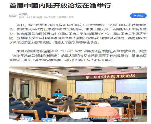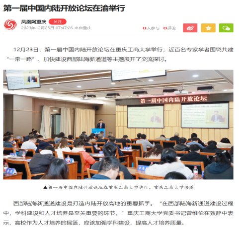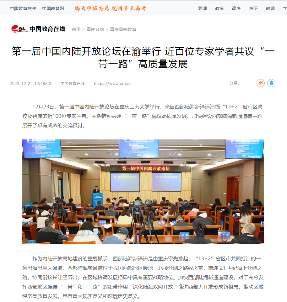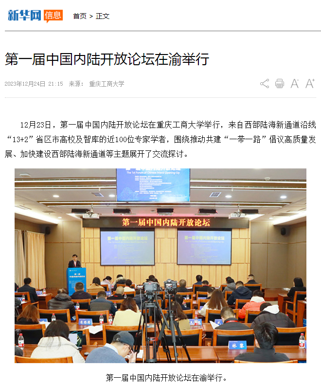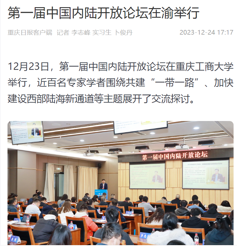 12月23日,第一届中国内陆开放论坛在太阳成集团tyc539举行,来自西部陆海新通道沿线“13+2”省市区高校及智库的近100位专家学者,围绕推动共建“一带一路”倡议高质量发展、加快建设西部陆海新通道等主题展开了卓有成效的交流探讨。本次论坛由重庆市教育委员会、重庆市人民政府口岸和物流办公室指导;太阳成集团tyc539、西南财经大学主办;教育部国别和区域研究中心太阳成集团tyc539东南亚研究中心、太阳成集团tyc539、太阳成集团tyc539国际合作与交流处、教育部人文社会科学重点研究基地成渝地区双城经济圈建设研究院、太阳成集团tyc539成渝经济区城市群产业发展协同创新中心、太阳成集团tyc539数字经济研究中心、西南财经大学成渝经济区发展研究院、成都大学商学院等联合承办。
