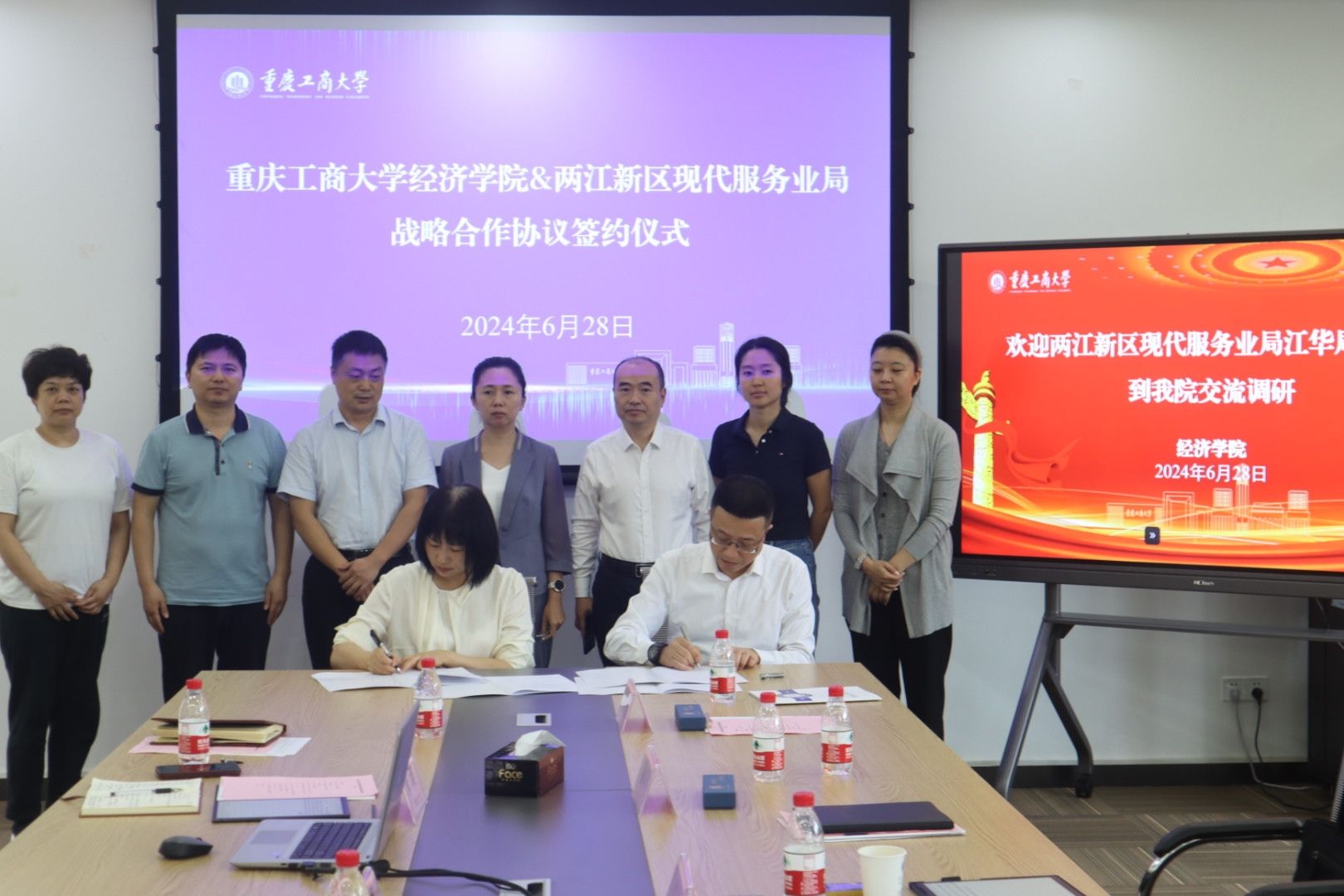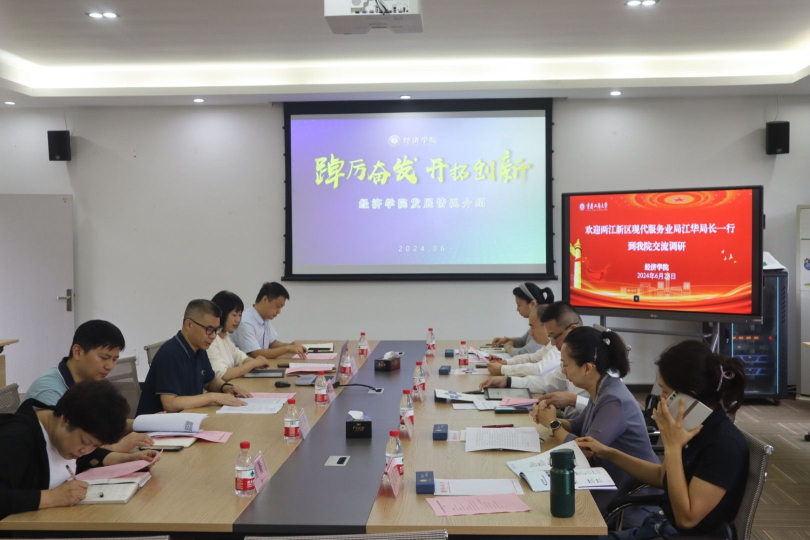 2024年6月28日,重庆两江新区管委会现代服务业局局长江华率领全体领导班子及科级干部到太阳成集团tyc539交流调研。太阳成集团tyc539党委常委、副校长李敬,太阳成集团tyc539全体领导班子及相关代表,重庆两江新区管委会现代服务业局领导班子及相关代表共同出席了此次活动。