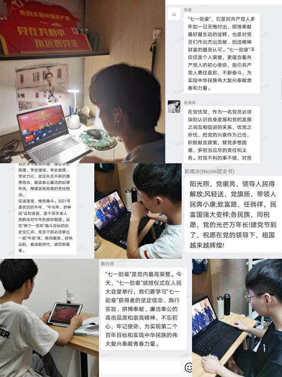 正值期末考试期间,同学们在教室、图书馆、宿舍采用分散学习的方式观看颁奖仪式,学习习近平总书记在“七一勋章”颁授仪式上的重要讲话。授勋仪式上,王继才“守岛就是守国”;张富清60余年“深藏功与名”;马毛姐在手臂中弹的情况下依然咬牙坚持,不畏枪林弹雨6次横渡长江;黄大发“水过不去、拿命来铺”的誓言;张桂梅扎根贫困地区40余年,创办全国第一所全免费女子高中,帮助1800多名贫困山区女孩圆梦大学等等,每一个事迹,都让我震撼和感动。29位获得者中,有4位是百岁老人。100年波澜壮阔,100年风雨征程。从革命、建设到改革,从救国、兴国到强国,他们用行动践行着初心与使命。