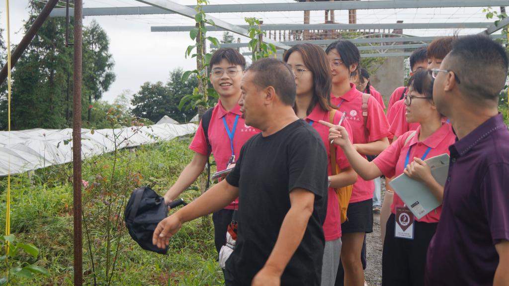 近年来,南川区多措并举,通过拓展水果产业链条发展、探索“公司+基地+农户”发展模式等多举措,推动了水果产业的高质量发展,有效助推乡村振兴。黎香湖镇北湖村村民充分利用当地良好的自然条件,种植葡萄、百香果、蜂糖李、脆甜柿等多种类水果,打造生态观光采摘园,良好推进当地的经济和社会效益发展。其中,重庆市南川区辰瑞农业开发有限公司作为当地典型示范企业,引进了阳光玫瑰、夏荷、玫瑰香等不同品种的葡萄,利用目前现有的先进技术和当地闲置215亩的土地进行有机种植,并已获得国家绿色有机认证。在公司创始人周建伟的带领下,实践团一行在种植园中仔细观察不同植物,了解如何利用当地的资源进行不同种类果树的种植和培养。实践团也发现种植园中正在建设现代化生猪养殖场,通过将猪粪、秸秆发酵为有机化肥促进果树生长,从而与种植园融合发展,形成将多产业能够结合起来的有机循环系统。
