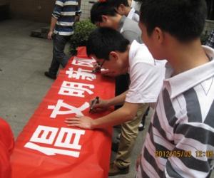 2012年5月3日中午12时,北二十一栋楼管会及党员服务站成员来到北21栋楼下,向楼栋同学宣传《文明修身倡议书》和经济贸易学院大学生文明修身行动实施方案的相关内容,并邀请楼栋同学在横幅上签字。同学们在横幅上写下的一笔笔,都是有着对校庆的祝福,对自身文明修身的承诺。由于活动参与人数众多,活动氛围良好,活动过程中还吸引了周边楼栋的其他学院同学以及部分登山路过的人员。