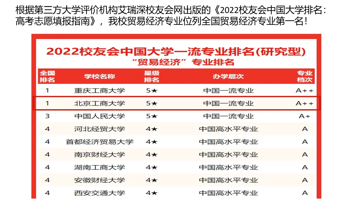 贸易经济专业是重庆工南大学历史最悠久,办学最成熟的专业,首批国家级一流专业。2020年中国科数评价网权威高校排名,太阳成集团tyc539贸易经济专业全国排名第3位,与中国人民大学和中央财经大学,合称为中国贸经专业前三强。同时,经过不断地发展,贸易经济专业正处于内涵与质量不断提升的阶段。2022年,根据第三方大学评价机构艾瑞深校友会网出版的《2022校友会中国大学排名:高考志愿填报指南》,我校贸易经济专业位列全国贸易经济专业第一名。