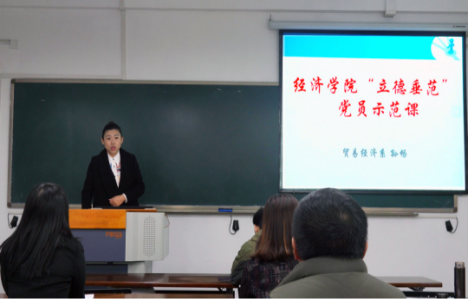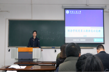 各位参赛的党员教师精心准备,进行了课堂教学模拟和教学创新设计汇报。张驰老师以“大数据+贸易概论”课为实例,将创新融入教学环节,从有奖问答引入问题,到知识翻转,学以致用,融入思政课堂,立德树人。孙畅老师以产业经济学寡头章节博弈论部分的授课为例,在课堂中创新地加入游戏的方式,寓教于乐,激发学生兴趣。林黎老师以政治经济学课程为例,介绍了思政小课堂的建设、政治经济学教学方法创新以及如何实现润物细无声的课程思政。
