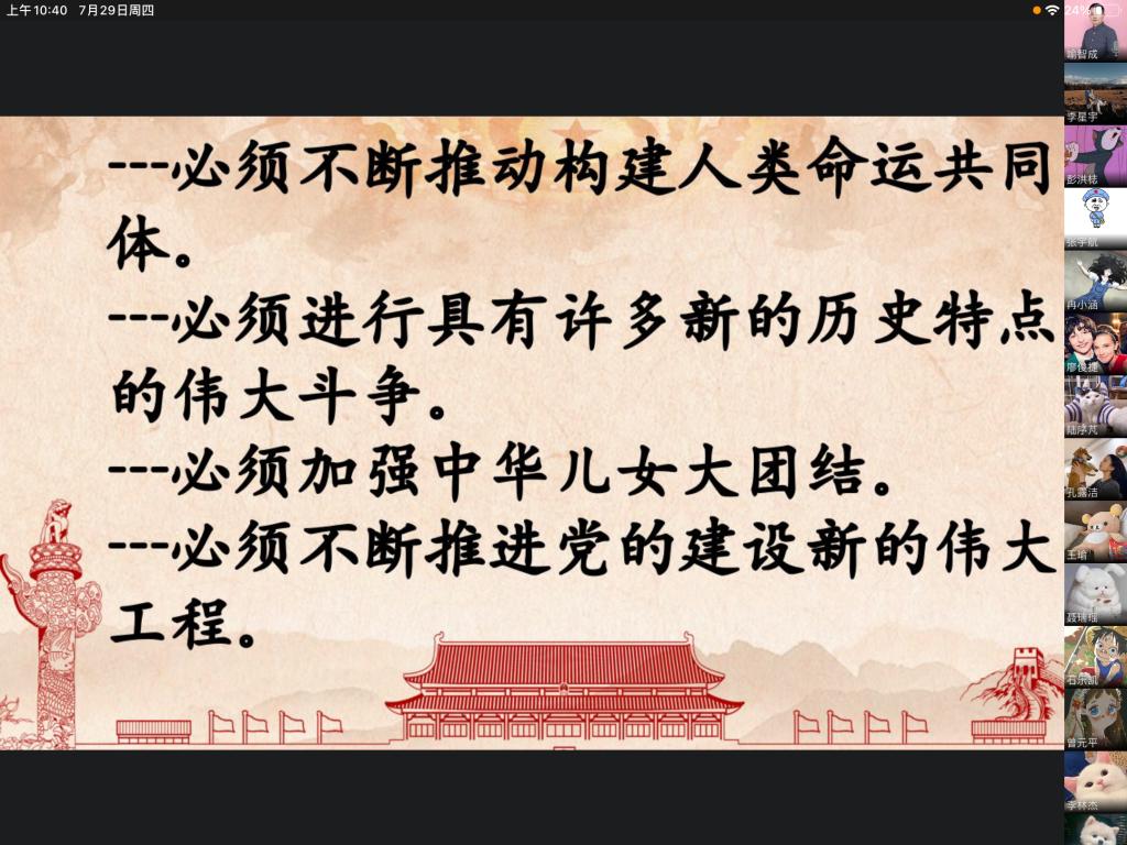 会上,全体党员在喻智成老师的带领下,再次温习了习总书记在“七一”讲话的主要内容。在“七.一”讲话中,习总书记代表党和人民庄严宣告,经过全党全国各族人民持续奋斗,中国实现了第一个百年奋斗目标,在中华大地上全面建成了小康社会,历史性地解决了绝对贫困问题,正在意气风发向着全面建成社会主义现代化强国的第二个百年奋斗目标迈进。习总书记回顾了为了实现中华民族伟大复兴,中国共产党团结带领中国人民,创造了新民主主义革命、社会主义革命和建设、改革开放和社会主义现代化建设、新时代中国特色社会主义四个阶段的的伟大成就。以史为鉴、开创未来,在新的征程上,习总书记强调我们必须坚持中国共产党坚强领导、必须团结带领中国人民不断为美好生活而奋斗、必须继续推进马克思主义中国化、必须坚持和发展中国特色社会主义、必须加快国防和军队现代化、必须不断推动构建人类命运共同体、必须进行具有许多新的历史特点的伟大斗争、必须加强中华儿女大团结、必须不断推进党的建设新的伟大工程才能继续成功,从而在新的征程上更加坚定、更加自觉地牢记初心使命、开创美好未来。在“七.一”讲话中,习总书记表明了我们在香港、澳门、台湾上问题上的态度,一方面我们要维护国家主权、安全、发展利益,维护特别行政区社会大局稳定,保持香港、澳门长期繁荣稳定。另一方面,任何人都不要低估中国人民捍卫国家主权和领土完整的坚强决心、坚定意志、强大能力!同时我们也绝不接受“教师爷”般颐指气使的说教!在“七.一”讲话中,习总书记寄语青年,新时代的中国青年要以实现中华民族伟大复兴为己任,增强做中国人的志气、骨气、底气,不负时代,不负韶华,不负党和人民的殷切期望!最后,习总书记号召全体中国共产党员牢记初心使命,坚定理想信念,践行党的宗旨,永远保持同人民群众的血肉联系,始终同人民想在一起、干在一起,风雨同舟、同甘共苦,继续为实现人民对美好生活的向往不懈努力,努力为党和人民争取更大光荣!