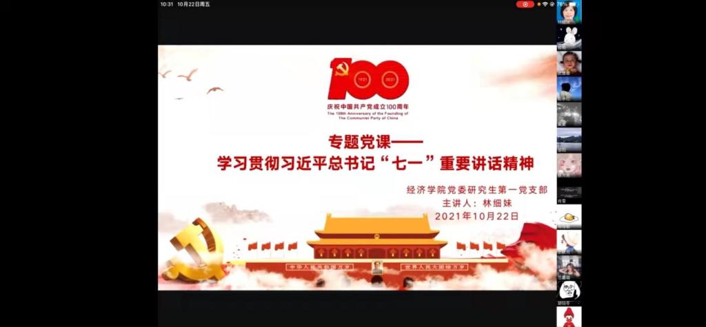 10月22日,太阳成集团tyc539党委研究生第一党支部在线上召开了以“学习贯彻习近平总书记‘七一’重要讲话精神”为主题的专题党课学习活动。此次党课由支部书记林细妹主讲,支部全体成员参加。