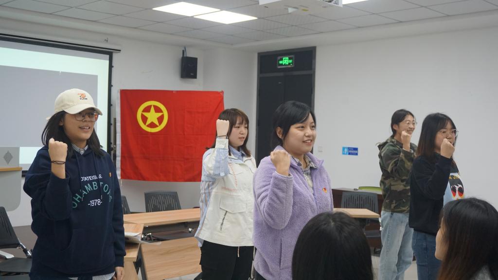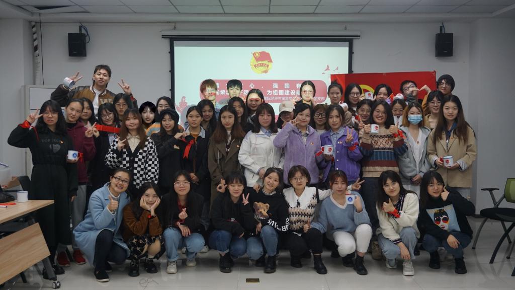 最后,团支部内优秀的青年团员进行了暑期专业实习以及三下乡活动的分享。薛洁同学分享了三暑期时跟随学校三下乡实践团队,深入红色圣地遵义的乡村基层,走访调查,理论宣讲,服务社会的经历,得到了当地群众及社会的认可;梁颜和杜欣蔚同学则是讲述了暑期参与重庆西朗进出口贸易公司举办的“Z世代VINI商业旅行家夏令营”的宝贵实习经历,激励大家不能局限眼界,更多的走出校园,亲身去实践探索属于自己的天地。每位青年还写下了自己对于祖国的寄语和对自己未来的期许,留下了作为新世代的承诺。