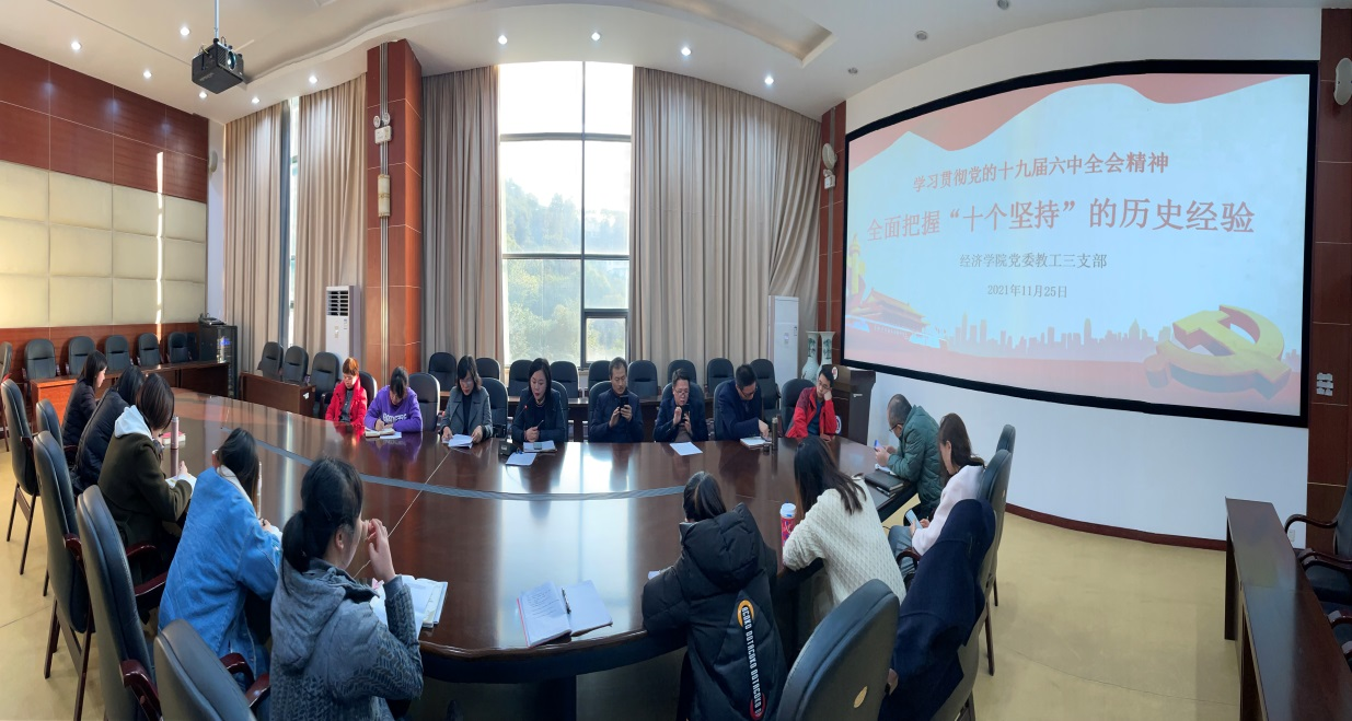 首先,邓雪霜同志围绕党的十九届六中全会通过的《中共中央关于党的百年奋斗重大成就和历史经验的决议》,以“坚持党的领导,坚持人民至上,坚持理论创新,坚持独立自主,坚持中国道路,坚持胸怀天下,坚持开拓创新,坚持敢于斗争,坚持统一战线,坚持自我革命”为主线,深刻学习领会党的百年奋斗重大成就和历史经验。她谈到,“十个坚持”是党和人民共同创造的精神财富,是百年大党永葆生机活力的关键所在,是我们党引领中华民族伟大复兴的指南。把握好、坚持好、运用好、发扬好“十个坚持”,肩负使命担当,追逐伟大梦想。然后,支部成员进行交流。雷菁同志谈到十九届六中全会通过的决议融汇了百年来中国共产党践行为中国人民谋福利、为中华民族谋复兴的初心使命所进行的奋斗、牺牲和创造,有利于全党统一思想、统一意志、统一行动,团结带领全国各族人民以史为鉴、开创未来。王燕同志谈到“十个坚持”充满力量,坚持和发扬党百年奋斗的宝贵历史经验,团结一致同心干,风雨无阻向前进,在新征程上创造新的历史伟业。林新竹同志谈到做好十九届六中全会学习和宣扬,广泛团结和引领青年,肩负强国使命,把个人小我融入祖国大我。张涛同志谈到十个坚持”是系统完整、相互贯通的统一体,深刻揭示了党和人民事业不断成功的根本保证,揭示了党始终立于不败之地的力量源泉。曾庆均同志谈到“十个坚持”是历史逻辑、理论逻辑、实践逻辑的有机统一,也是层次分明、前后呼应、相得益彰的复合体。最后,李自维同志总结谈到结合工作实际,认真、扎实、深入学习十九届六中全会,全院上下统一思想谋发展,全面贯彻党的教育方针,加快学院“双一流”建设,推动学院改革发展事业迈上新台阶,培育德智体美劳全面发展的学生,肩负教育事业额使命和责任。支部的其他党员也都通过书面的形式提交了学习心得。