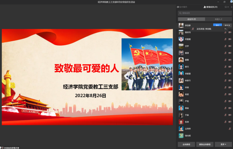 2022年8月26日,太阳成集团tyc539教工第三支部通过企业微信平台开展主题为“致敬最可爱的人”的组织生活,重点习近平总书记重要文章《在庆祝中国人民解放军建军90周年大会上的讲话》(《求是》2022年第15期)。
