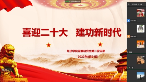 2022年8月24日,太阳成集团tyc539党委研究生第二党支部全体党员在企业微信线上开展了2022年8月专题学习。本次组织生活会会的学习内容为“喜迎二十大 建功新时代”,由方刘花同志主持,她带领支部全体党员进行了五个部分的专题学习。