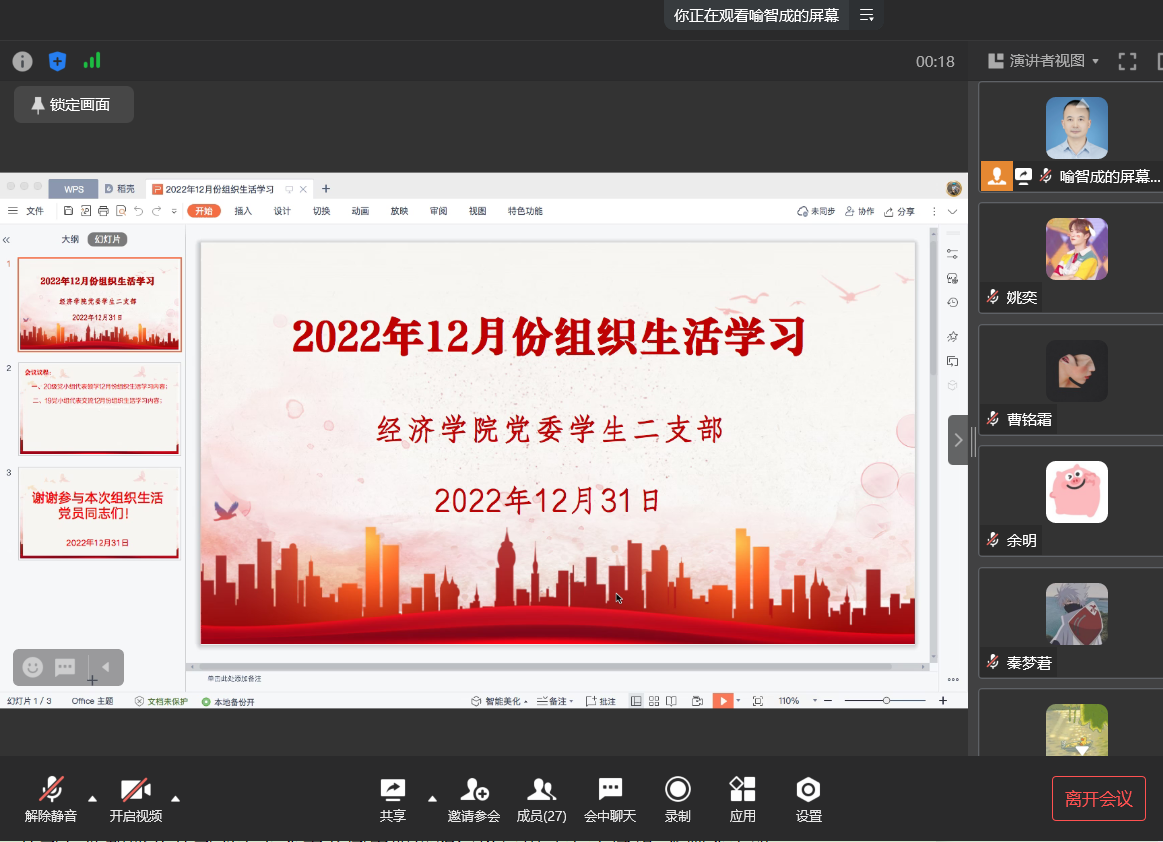 2022年12月31日,太阳成集团tyc539党委学生第二党支部在企业微信线上开展12月份组织生活学习。参与活动的有太阳成集团tyc539第二党支部书记喻智成老师、二支部全体党员,活动由喻智成主持。
