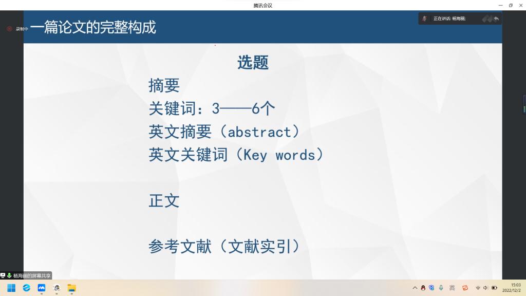 指导会上,杨海丽老师结合以往教学经验和党的二十大精神对当代大学生提出相关要求,进而引出学术论文写作应具备的条件。从阅读论文、选好一个题目、论文提纲设计、论文难点四个方面向同学们进行了写作指导,每个方面都进行细致具体的分析,列举相关案例,解析各个方面的重要性,使同学们对论文写作有了明确思路。同学们结合自身情况,现场提问,杨老师耐心、针对性地回答同学们的问题,并引用优秀学生论文做出相关阐述。最后,喻老师对本次指导会做出总结,对参与的老师、同学表示感谢,对同学们提出殷切期望,并对后续的主题论文比赛做出相关安排和要求。