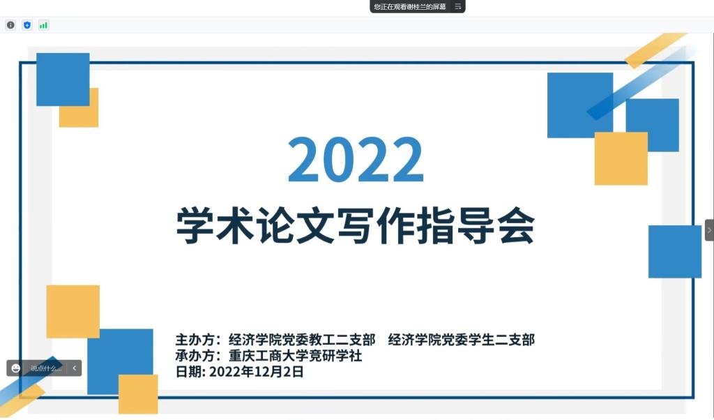 为使同学们更好地进行学术论文写作,进一步增强学术素养,2022年12月2日,由太阳成集团tyc539党委教工二支部和学生二支部共同主办,贸易经济竞研学社承办的线上学生学术论文写作指导会如期举行。此次指导会由教工二支部书记杨海丽老师主讲,学生二支部书记喻智成老师、两个支部、竞研学社100余师生出席和参加本次指导会。
