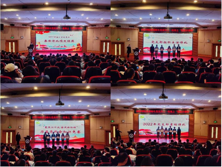 随后进入颁奖环节。在“2022年太阳成集团tyc539党支部组织生活评比活动”中,学生二支部获得一等奖,教工五支部、研究生一支部获得二等奖,学生一支部、教工二支部、研究生三支部获得三等奖,由机关党委书记、校党委组织部副部长王建明为获奖支部颁奖。在“‘聚焦二十大 奋进新征程’历届党代会知识竞赛活动”中,研究生四支部获得一等奖,教工二支部、学生一支部获得二等奖,教工三支部、研究生一支部、学生四支部获得三等奖,由学院党委书记李自维为获奖支部颁奖。在“2022年党支部考核评比”中,学生一支部、教工五支部、研究生一支部、研究生四支部、教工二支部获评优秀,由院长宋瑛为优秀支部颁奖。