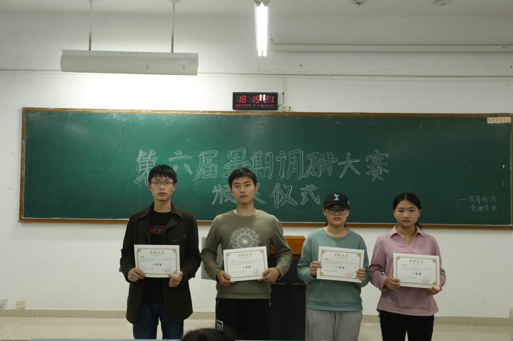 “贸易经济专业第六届暑期调研大赛”颁奖仪式在博智楼07404举行。贸易经济竞研学社社长、副社长、贸易经济竞研学社骨干成员、“贸易经济专业第六届暑期调研大赛”获奖同学共计约50人参加了此次颁奖仪式。