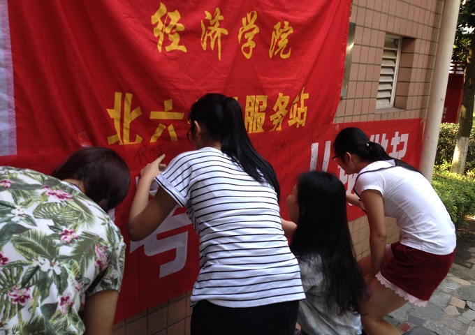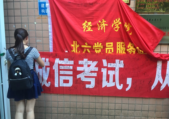 6月20日下午5点,为推动建设优良学风,北六党服于楼栋门口举办了“诚信考试,从我做起”签字活动,旨在让同学们在接下来的期末考试中,坚持诚信,拒绝作弊。