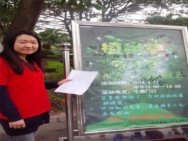 志愿者们与党服的同学们分成两批,一批给同学们介绍植树节的相关知识,另一批给同学们分发种子,并宣传种植方法,拿到种子的同学们到展板出签名来往的同学都十分热情的参加到此次活动,让植树节在校园里得到发扬,也一起倡导播种绿色的环保行为,共建和谐校园再次得以体现。通过普及植树节知识,提高了同学们的环保意识。