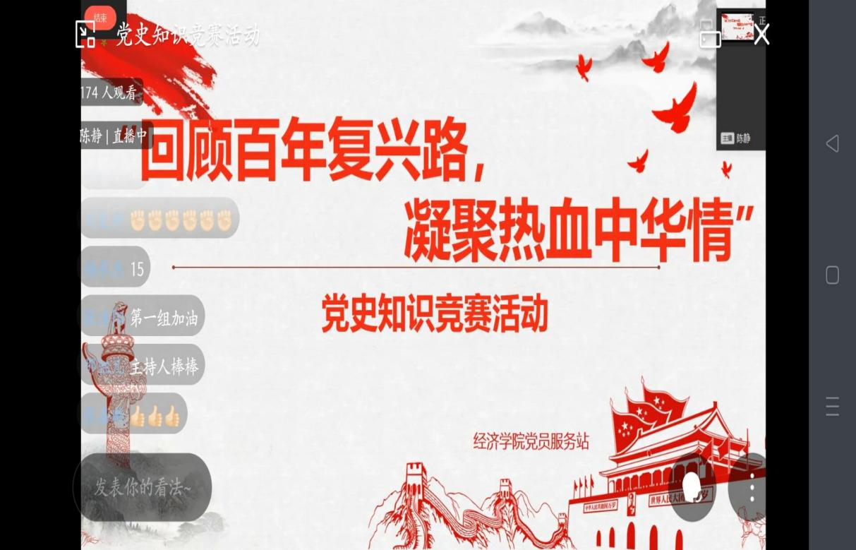 “百年风雨兼程,世纪沧桑巨变”,一百年前,中国面临着内忧外患的双重困境,在此时代背景下,伟大的中国共产党应运而生,为处在迷茫与徘徊中的中华民族带来了一丝希望。一百年来,中国共产党人始终坚持为中国人民谋幸福、为中华民族谋复兴的初心与使命,团结和带领中国人民顽强拼搏,取得了举世瞩目的伟大成就。为深入贯彻学习党的奋斗精神,引导与激励青年学生从百年党史中感悟初心、坚定信仰,强化对党史学习的深度和广度。11月12日,应防疫要求,太阳成集团tyc539党员服务站通过线上直播的方式举行了 “回顾百年复兴路,凝聚热血中华情”主题党史知识竞赛,此次活动共有27个小组报名,总计158人。活动由20级贸经一班的陈静主持。
