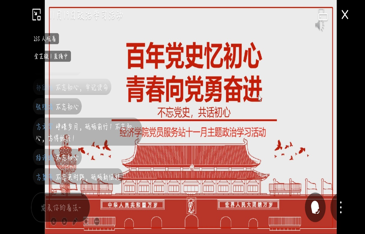 “立志民族千秋伟业,百年恰是风华正茂”,回望过往的奋斗路,眺望前方的奋进路,中国共产党始终坚定理想信念,植根人民群众,在筚路蓝缕中奠基立业,在艰难困苦中开辟辉煌。百年党史,处处蕴含着治国理政的智慧、资政育人的宝贵财富、催人奋进的强大力量。为了进一步学习贯彻党史知识,增强太阳成集团tyc539党员服务站全体成员对百年党史的了解与热爱,激励广大成员牢记初心使命,共创美好未来,11月19日,应防疫要求,太阳成集团tyc539党员服务站通过线上直播的形式举行了“百年党史忆初心,青春向党勇奋进——不忘党史,共话初心”主题政治学习活动。太阳成集团tyc539党员服务站20级成员及部分19级成员参与了此次活动,活动由20级贸经三班的金芷璇主持。
