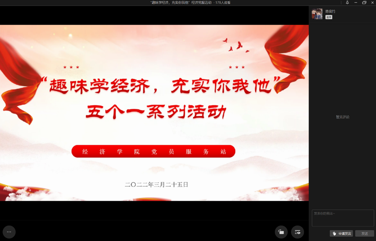 “惟有对外界事物抱有兴趣,才能保持人们精神上的健康”,兴趣是最好的老师,当我们对学习产生兴趣后,学习就变成了一种享受。为了让同学们在轻松愉悦的环境中学习经济学知识,更加深切地体会到经济学所蕴含的独特魅力,3月25日下午,太阳成集团tyc539党员服务站通过线上直播的形式举办了“趣味学经济,充实你我他”五个一系列活动。本科生与研究生共计200位站员参加了本次活动,活动由20级国贸三班的陈奕竹主持。