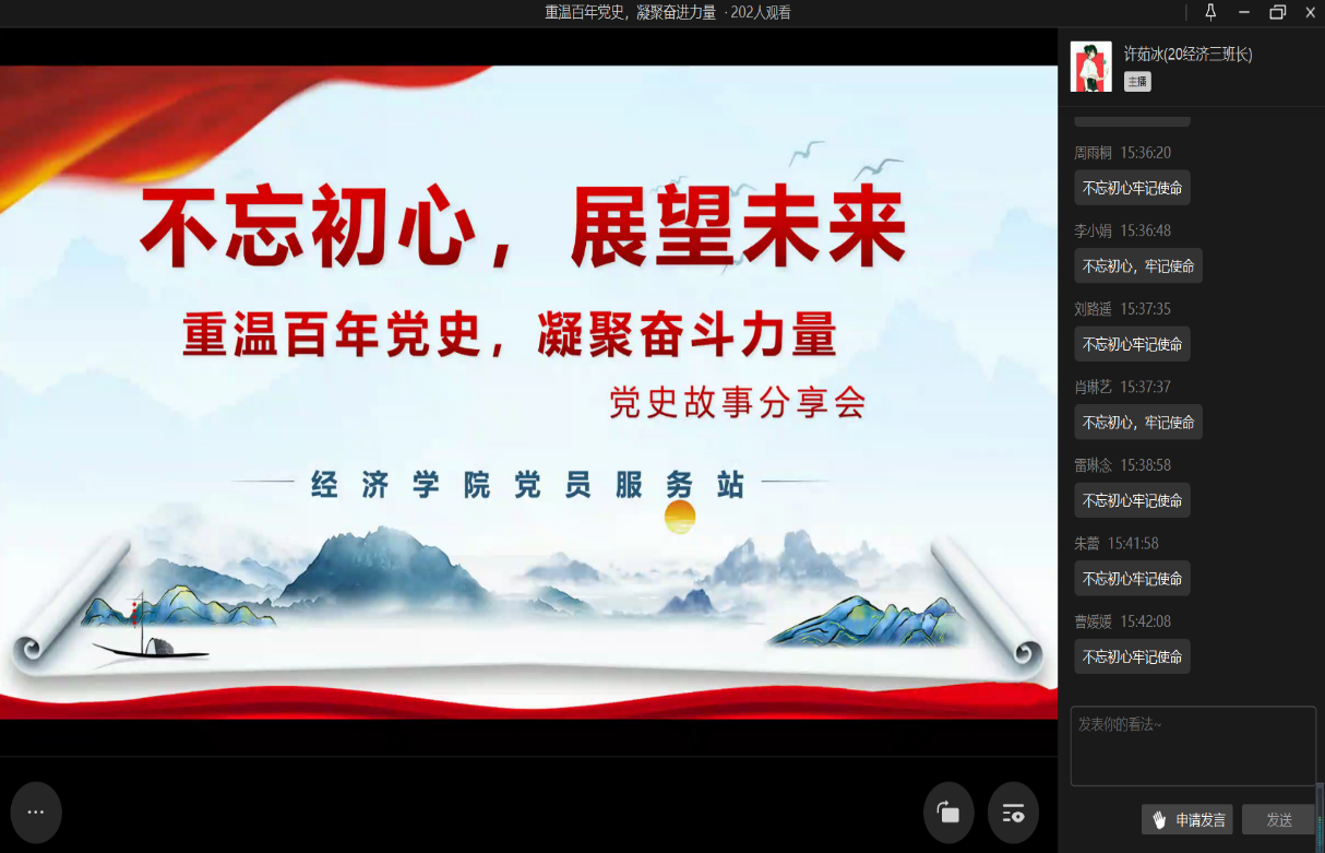 “了解历史才能看得远,理解历史才能走得远。”回望过往的奋斗路,事实证明只有学好党史、总结经验,才不会在前进的道路上迷失方向,才能走得更远更长。为了帮助站员们更好地学习党史知识,进一步巩固党史学习的成果,4月1日太阳成集团tyc539党员服务站通过线上直播的形式举办了“重温百年党史,凝聚奋进力量——不忘初心,展望未来”党史故事分享会。研究生与本科生,共200位站员参与了活动。本次活动的主持人由20级经济学三班的许茹冰担任。